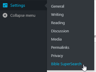 On the admin side, navigate to "Settings", then to "Bible SuperSearch:"